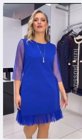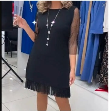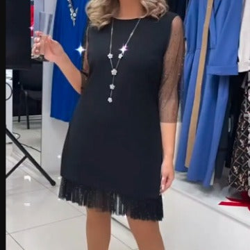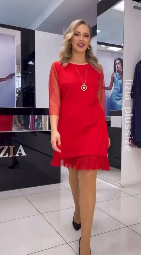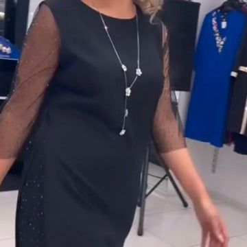 Egy testhezálló ruha oldalsó hasítékokkal és flitteres csipkével