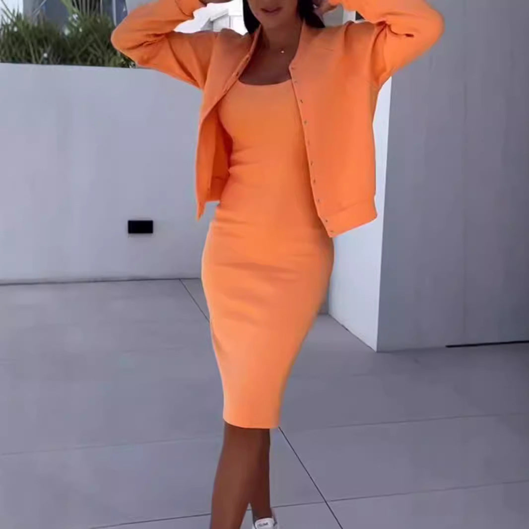 Egy dögös kétrészes szett harisnyaszoknyával és kabáttal