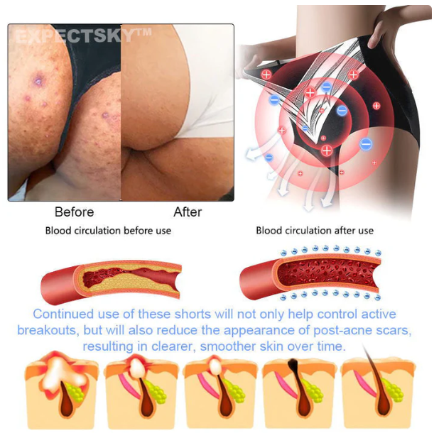 A negatív ionokat felszabadító titánszálak segítségével a rövidnadrág semlegesíti a szabad gyököket, csökkenti az oxidatív stresszt és elősegíti a méregtelenítést, amelyek kulcsfontosságúak a hegek, striák és pattanások csökkentésében, miközben enyhítik a nőgyógyászati ​​tüneteket. A vizsgálatok két hét alatt mutatják meg az eredményeket.