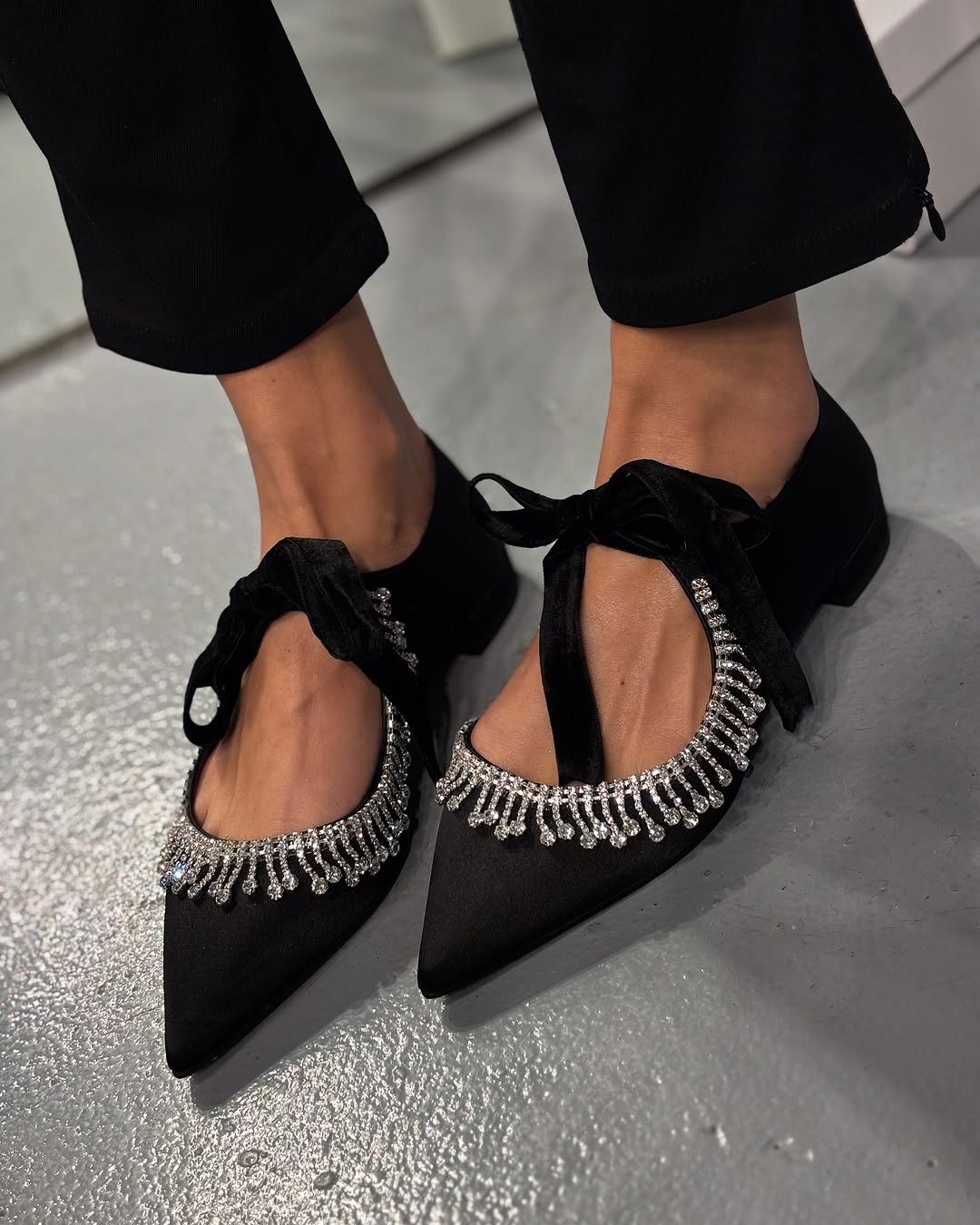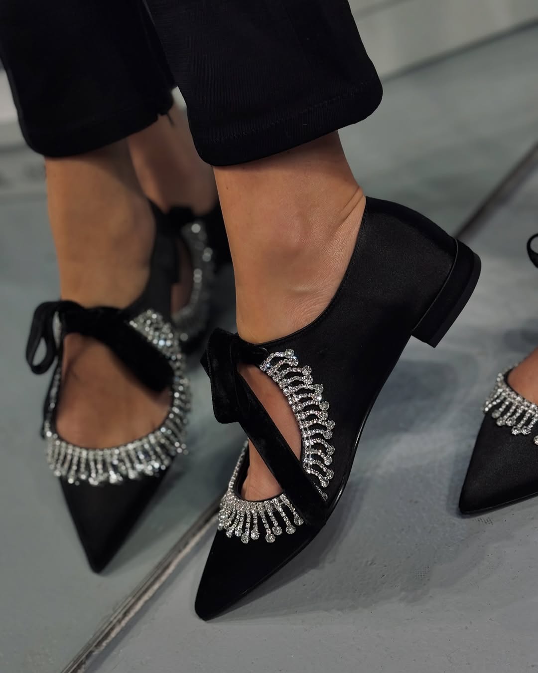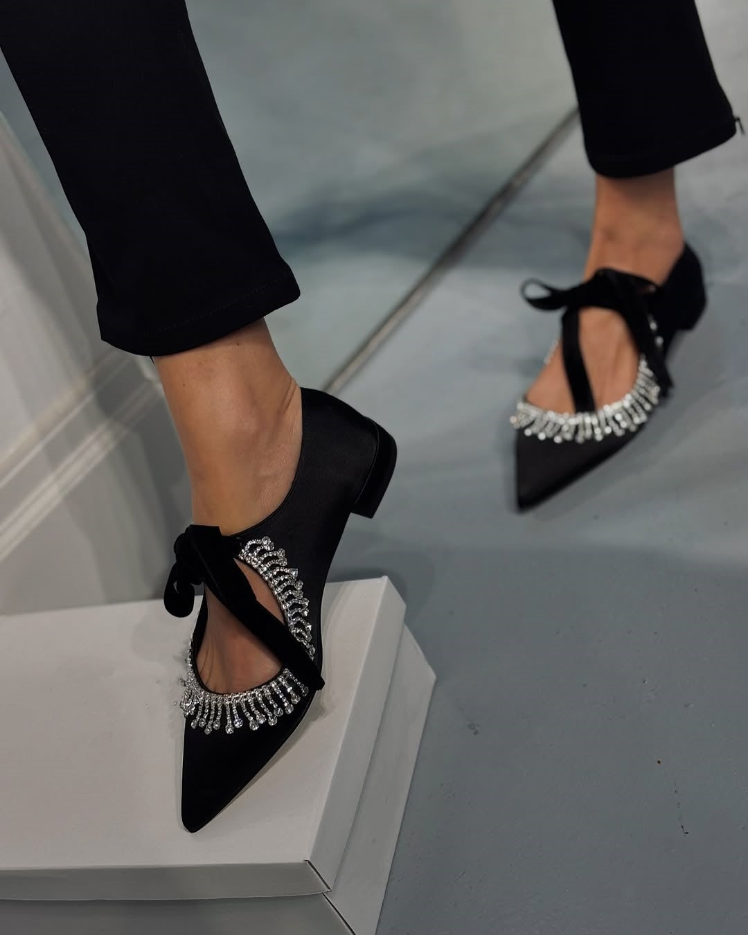 Medžiaga: Viršutinė dalis pagaminta iš minkšto, smulkios tekstūros atlaso. Deimantai tvirtai pritvirtinti ir blizga. Padas minkštas ir atsparus dilimui.