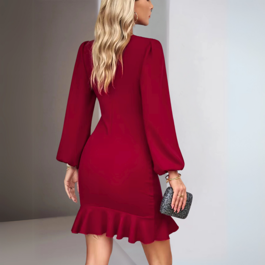 Elegáns ruha fodrokkal és puffos ujjakkal
