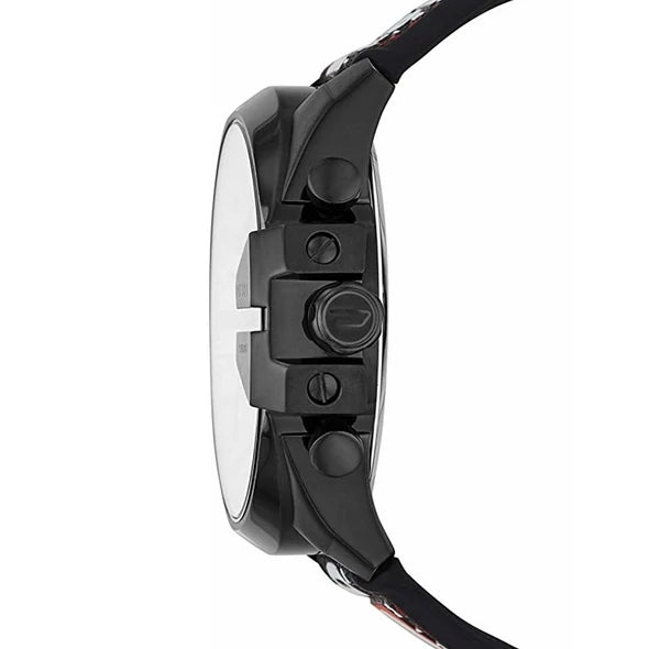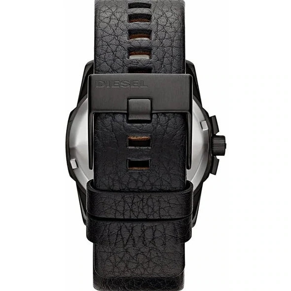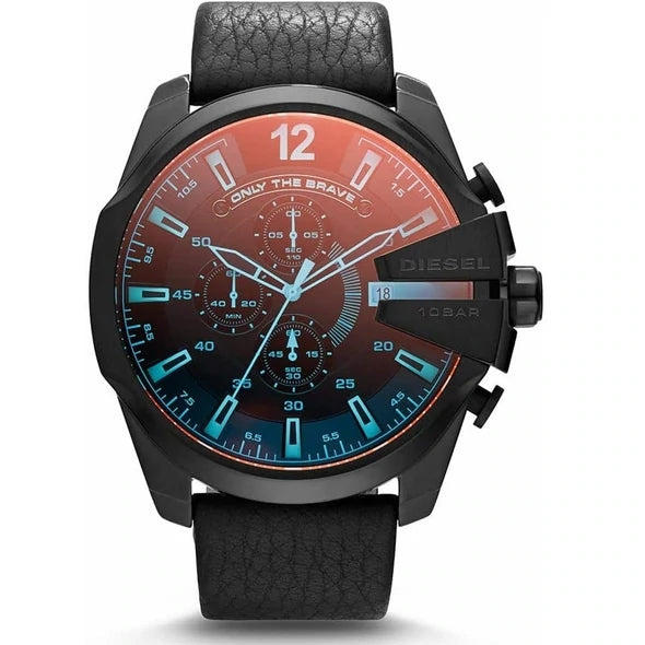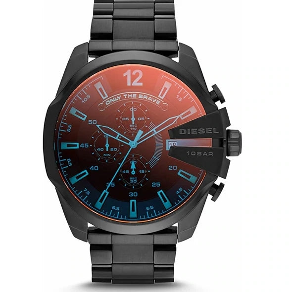 A Diesel Mega Chief karóra "Only the Brave" címkével és kivágással ellátott kronográffal rendelkezik. Három segédtárcsa segít nyomon követni a perceket, másodperceket és tizedmásodperceket.