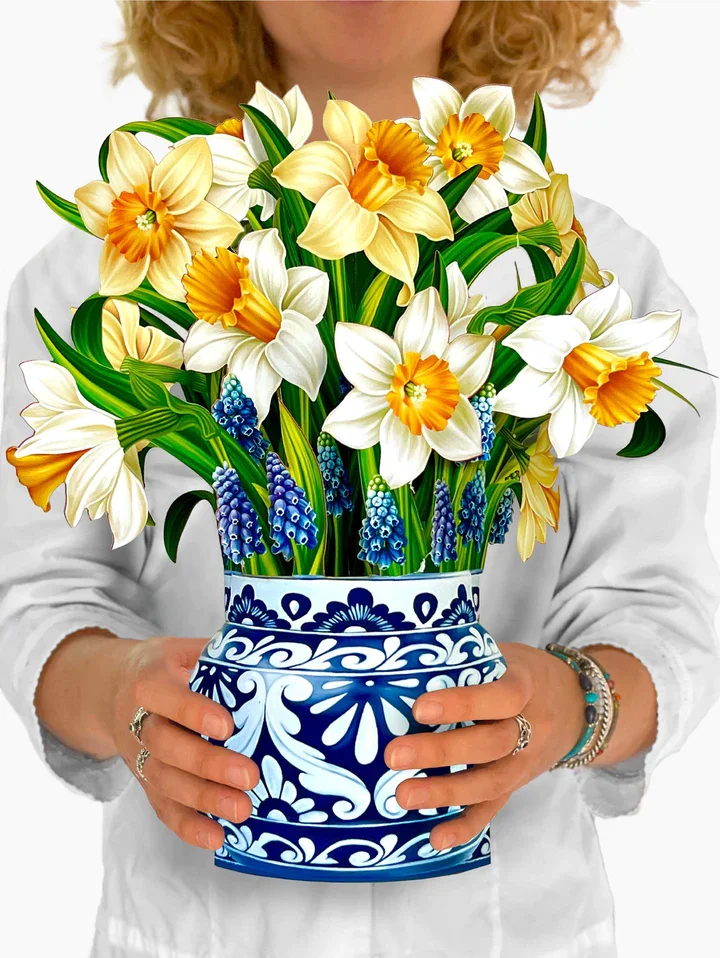 Angol nárciszok:  A Nárcisz Pop Up Bouquet egy gyönyörű kártya, amely a felemelő érzelmeket és támogatást ünnepli. A nárcisz egy strapabíró tavaszi virág, amely hagyományosan a kitartást és a sikert szimbolizálja. Ennek az elrendezésnek a fényes virágzása túléli a szokásos vágott virágokat, és továbbra is virágzik anélkül, hogy vízre vagy tartósítószerekre lenne szüksége. Könnyen karbantartható és hosszan tartó virágok, ezek a virágok még évekig megörvendeztetik az Ön különleges személyét.