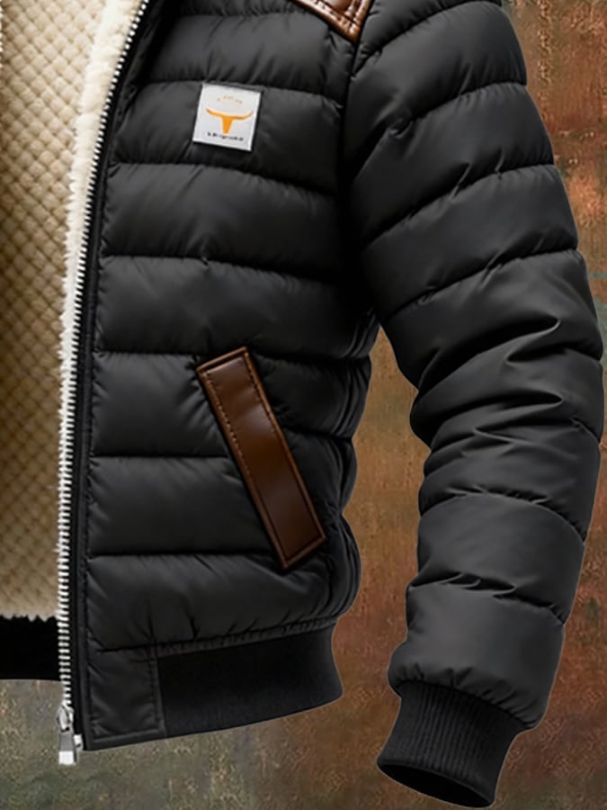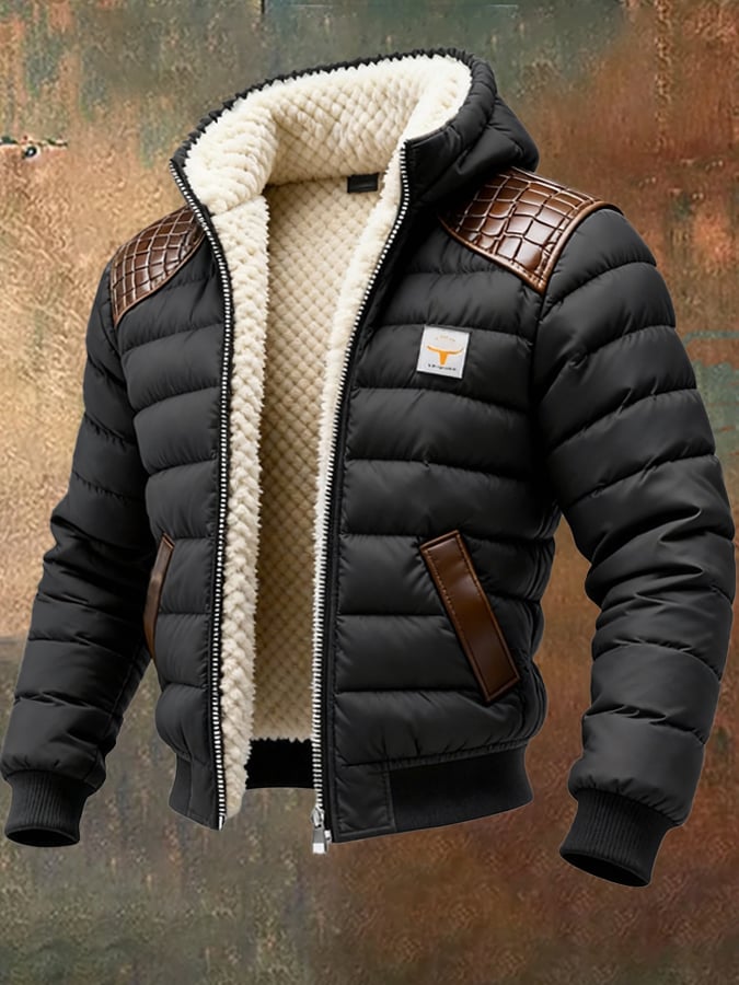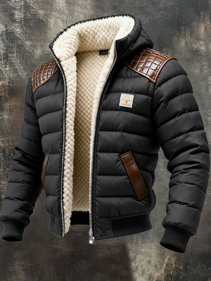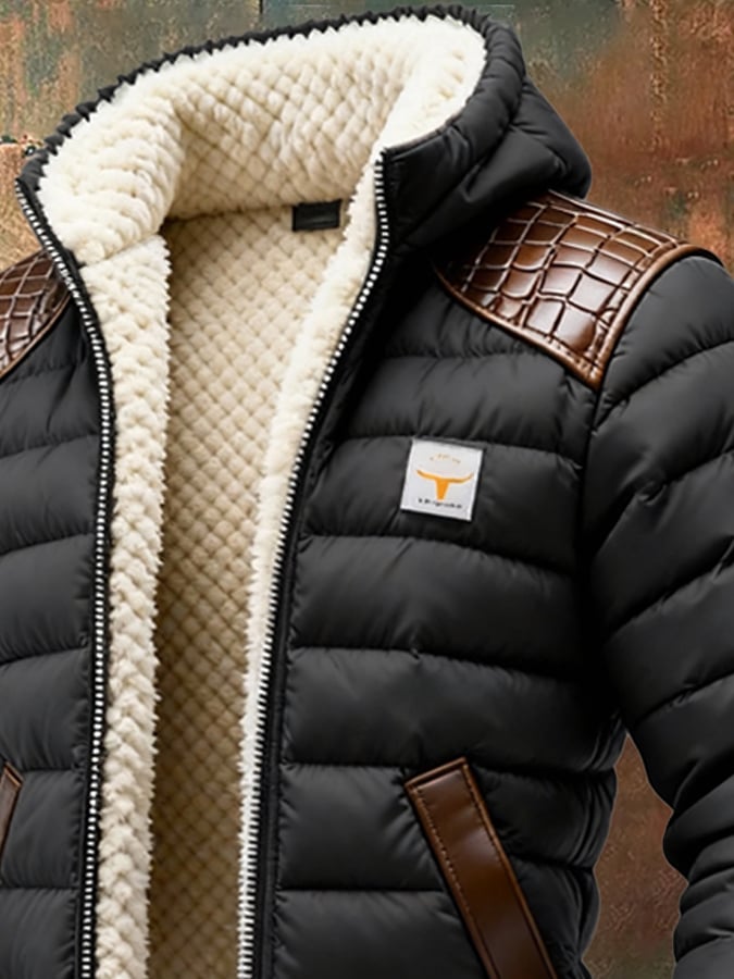 Férfi retró steppelt, patchwork plüss kültéri kabát cipzárral, meleg és kényelmes