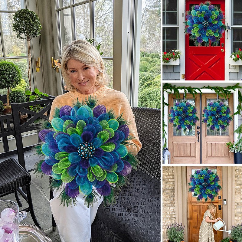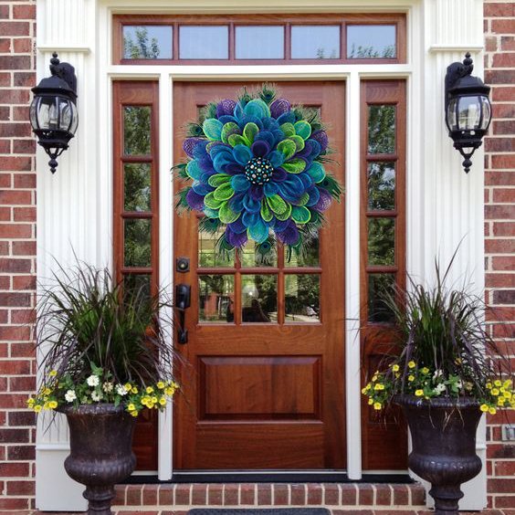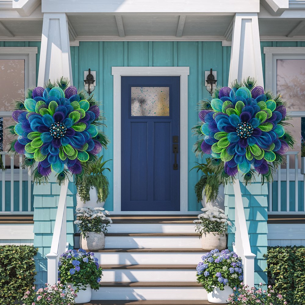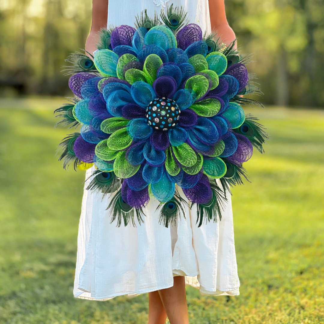 Ez a koszorú gyönyörű páva színekkel rendelkezik, mindenki figyelmét leköti, ideális ajtónak, falnak, szabadban is felakasztható.