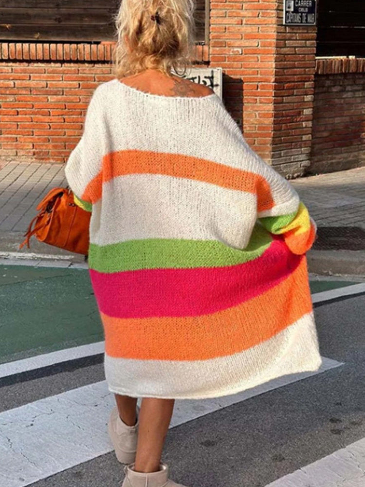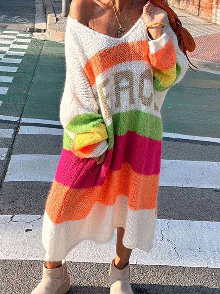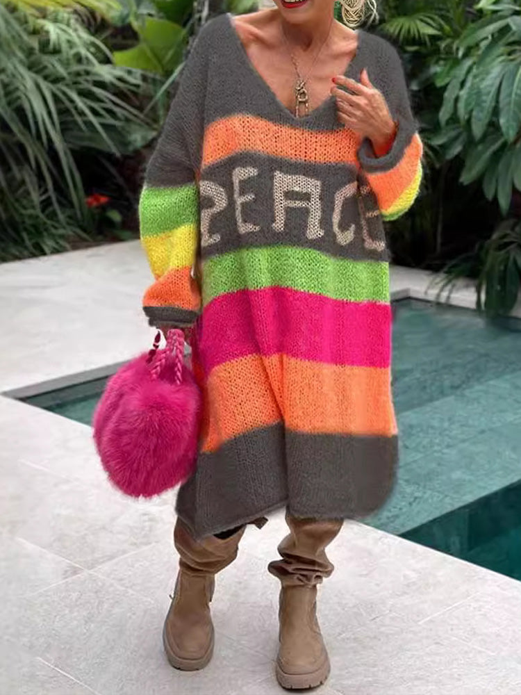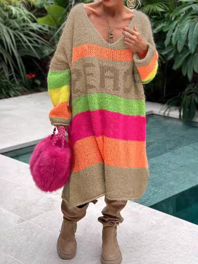 Színes, hosszú ujjú, V-nyakú, kasmírból készült pulóverruha