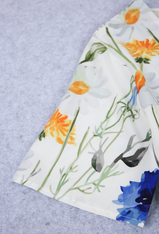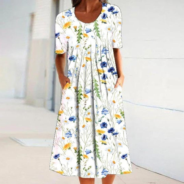 Sárga és kék virágos rövid ujjú és fehér pliszírozott midi ruha