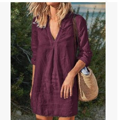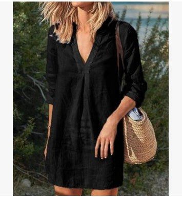 Divatos, közepes hosszúságú lezser vászon pamut ruha