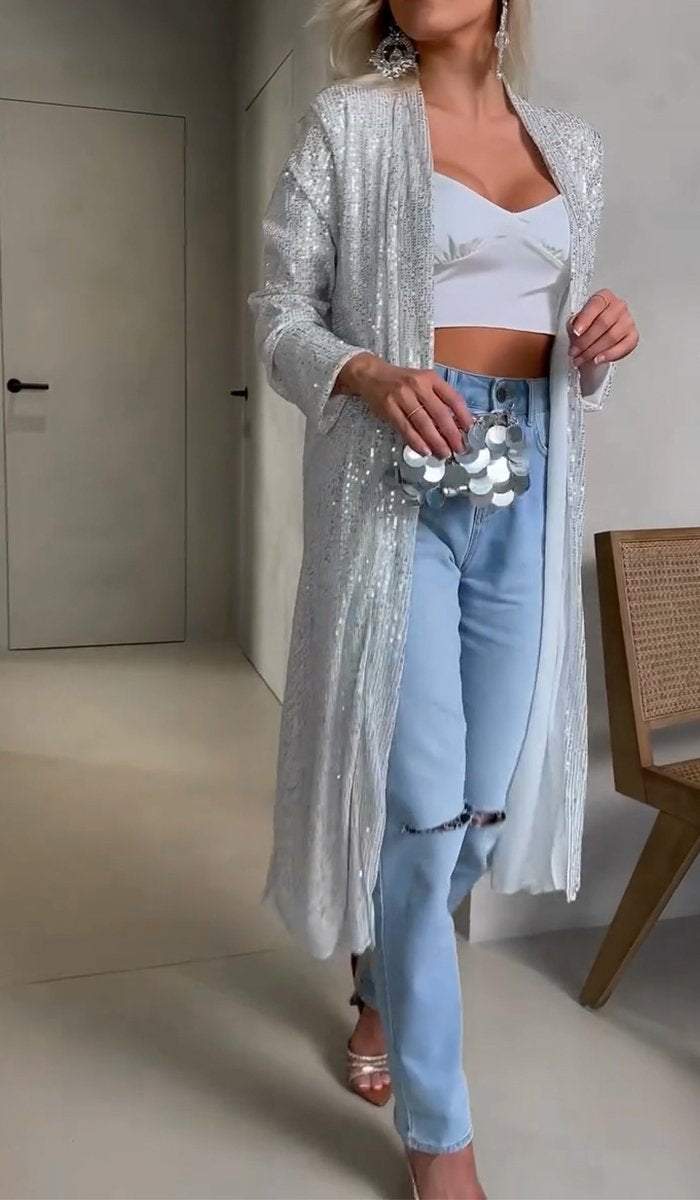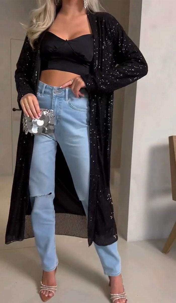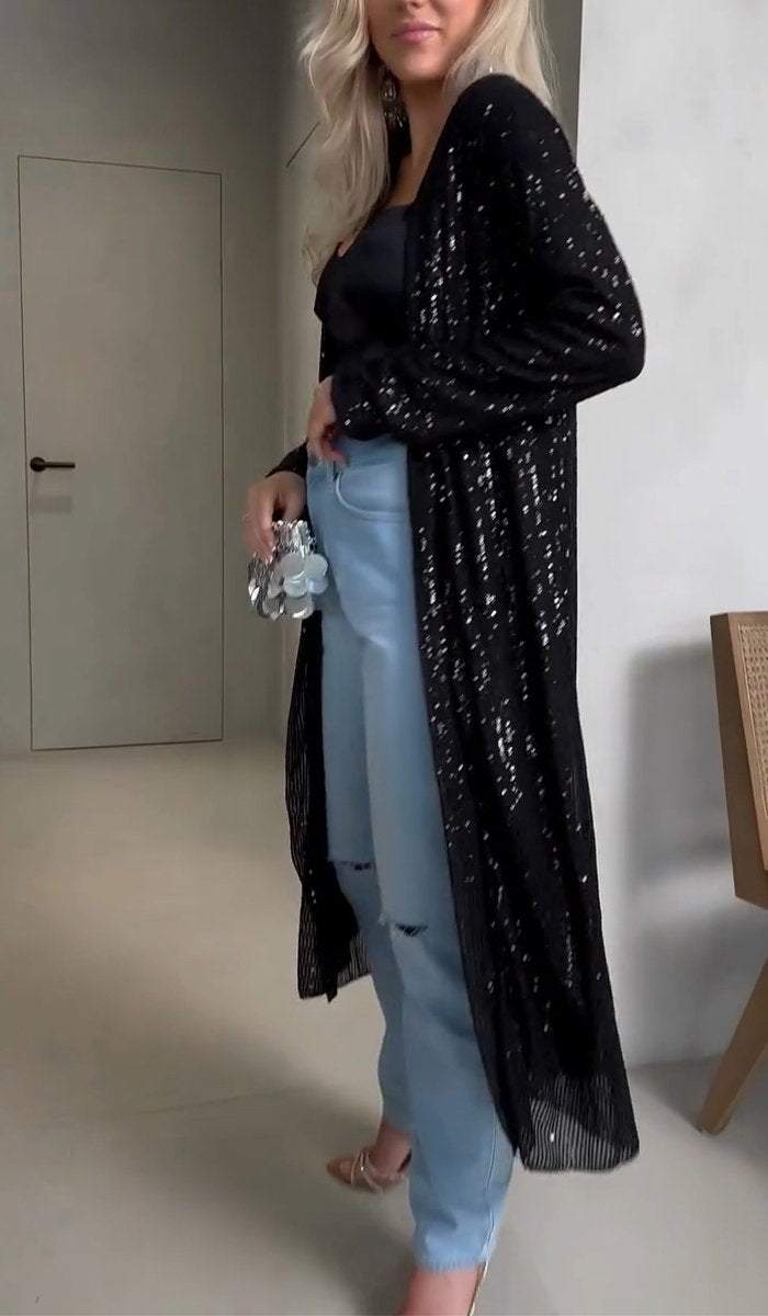 Divatos női kardigán kabát V-nyakkal és flitterekkel