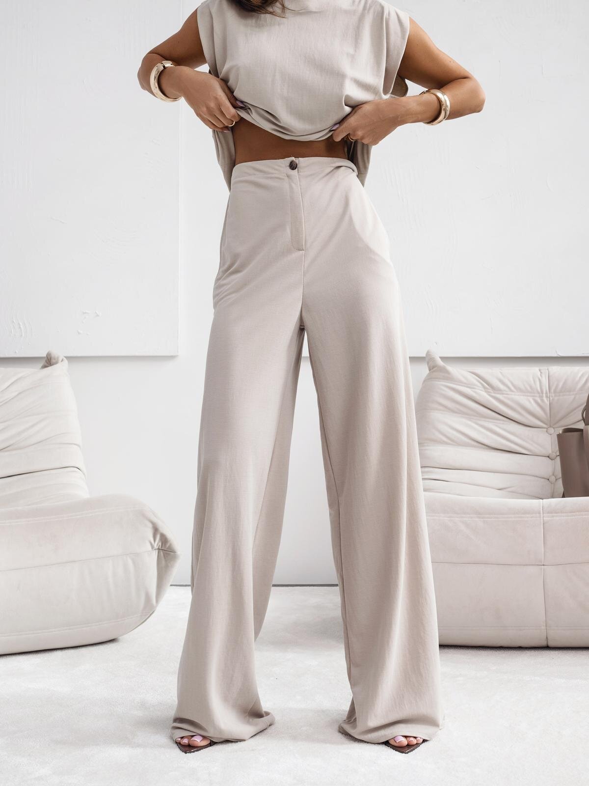 Komplett kétrészes szett - tartalmaz egy ujjatlan blúzt és egy bő szárú nadrágot. Ez egy stílusos, azonnal viselhető kombináció, amely leegyszerűsíti a ruhatárad kiválasztását bármilyen alkalomra.