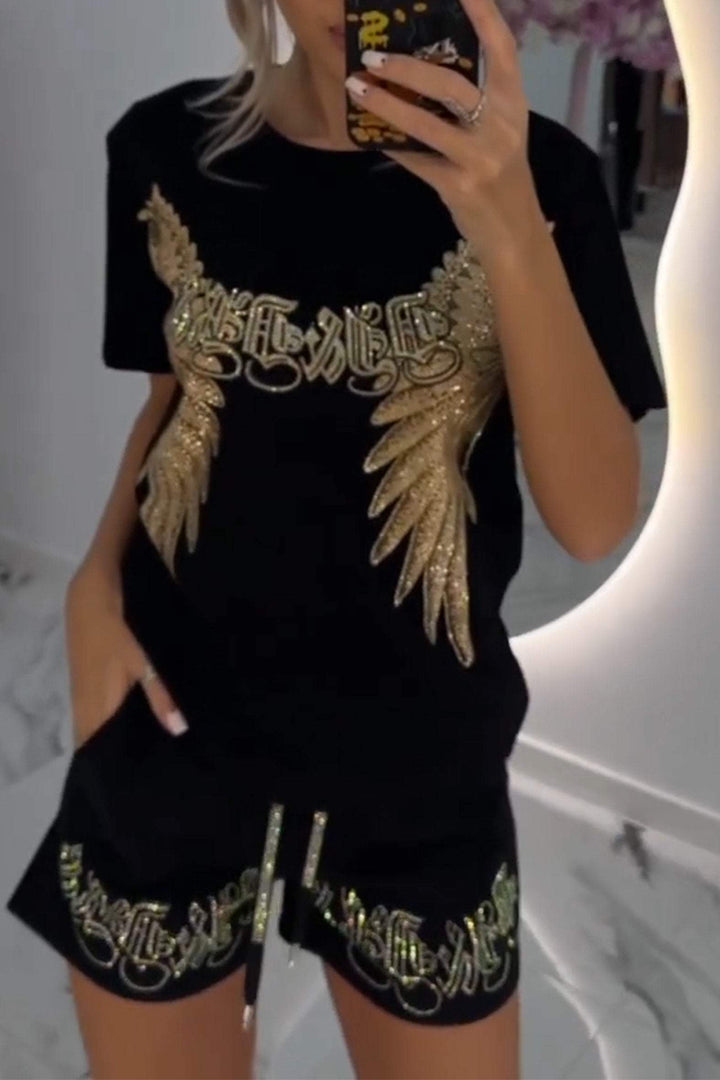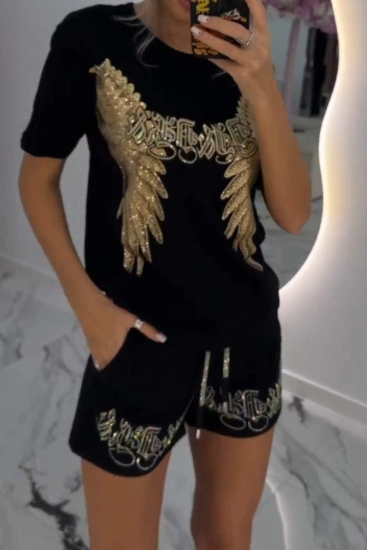 Dviejų dalių moteriškas ryškaus rašto viršus ir šortai