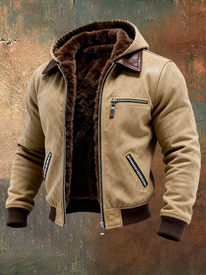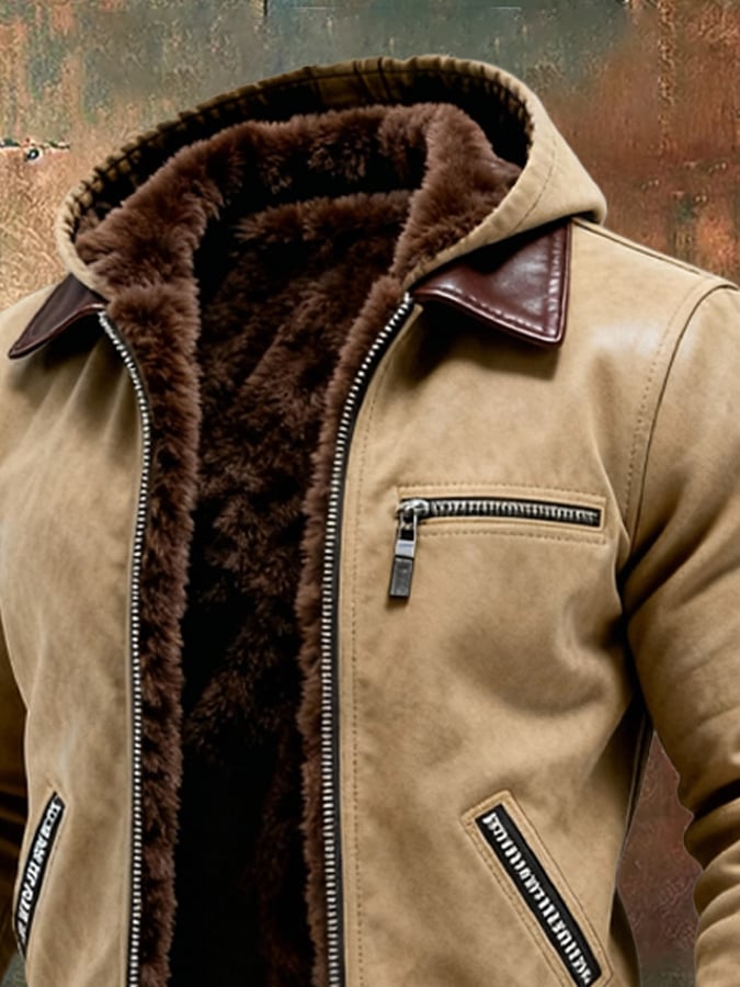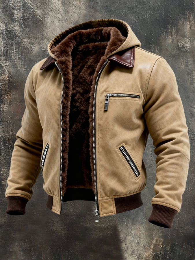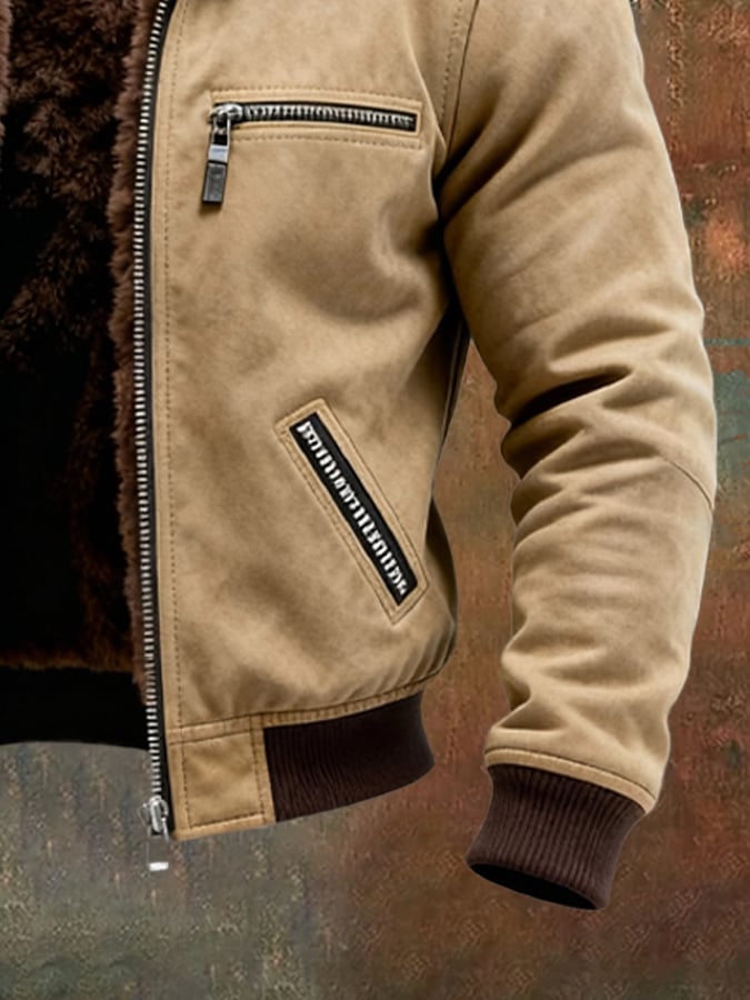 Férfi retró bőrkabát plüss béléssel, meleg, multifunkcionális, sok zsebbel, kültéri tevékenységekhez