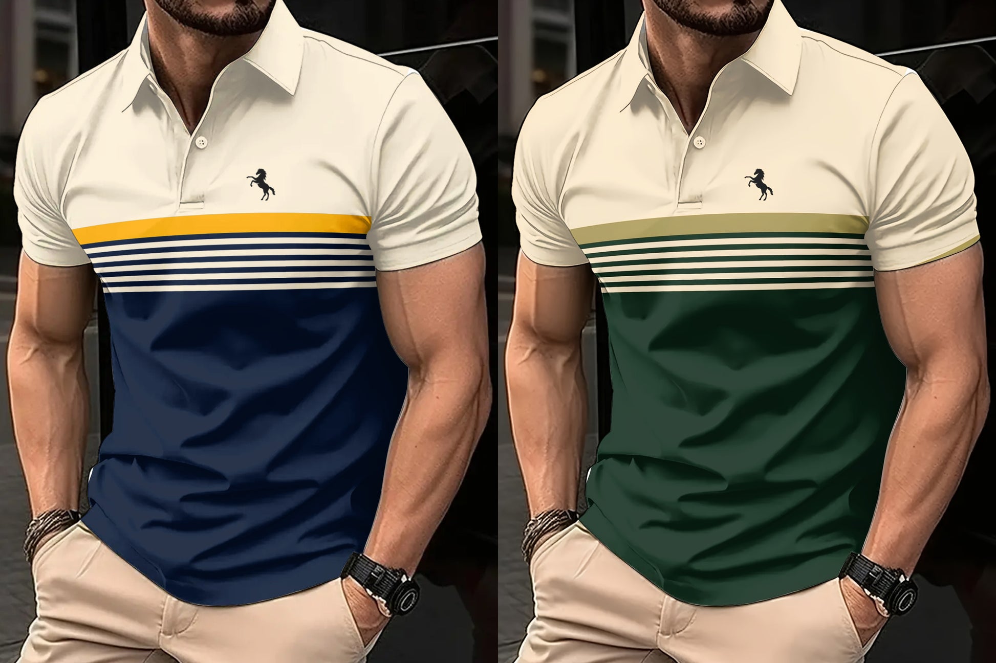 2 csomagos férfi hétköznapi rövid ujjú pólóingek, 3D lómintás, színes csíkok, sportos stílus, könnyű poliészter szövet, gombolható golfpóló